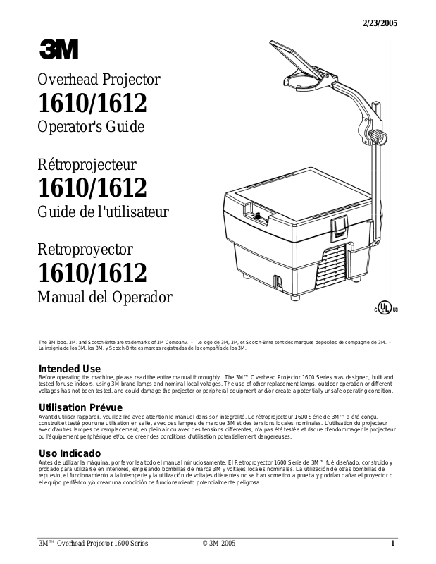 Before operating the machine, please read the entire manual thoroughly. The 3M™ Overhead Projector 1600 Series was designed, built and