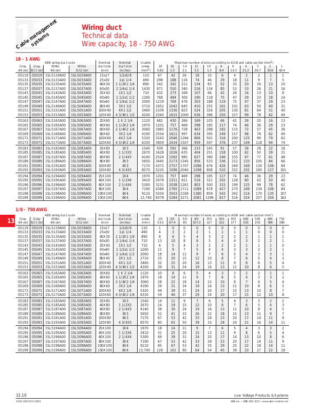 ABB wiring duct code Nominal Nominal Usable Maximum number of wires according to AGW and cable section (mm2)