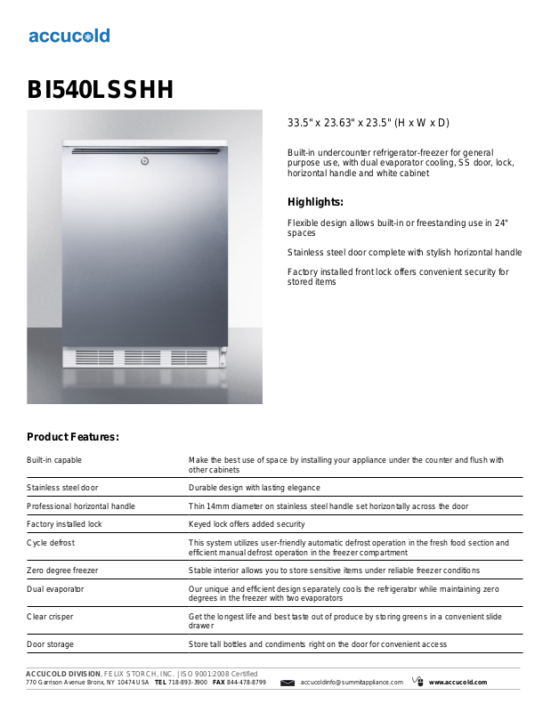 770 Garrison Avenue Bronx, NY 10474 USA TEL 718-893-3900 FAX 844-478-8799 accucoldinfo@summitappliance.com www.accucold.com
