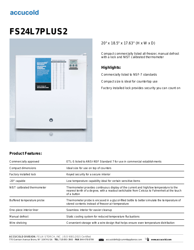 770 Garrison Avenue Bronx, NY 10474 USA TEL 718-893-3900 FAX 844-478-8799 accucoldinfo@summitappliance.com www.accucold.com