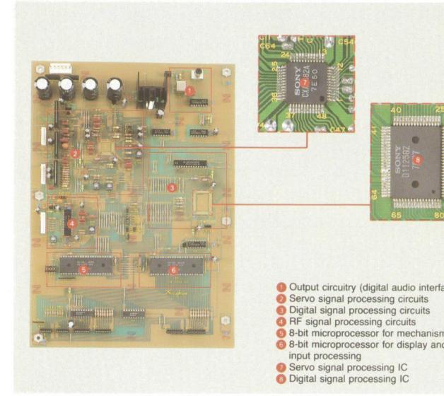 Servo circuits, signal processing circuits, nechanism control circuits, master clock generator, etc. ICs are also mounted on the other side.