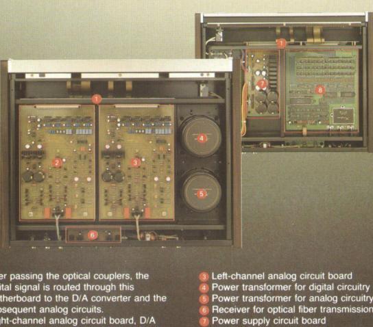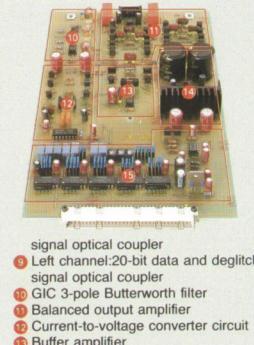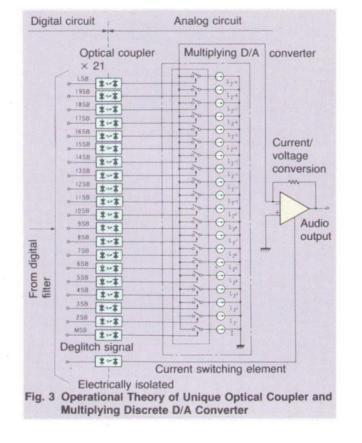 High-frequency noise from the digital section can have a disastrous effect on sound quality it permitted to enter the audio circuits. The D6-81L reliably prevents this by electrically separating the D/A converter from the preceding sections and transmitting the signal by optical means. The left section of Fig. 3 shows the operation principle. The data for each bit pass through a dedicated high-speed optoisolator (transmission rate 7 MBit/second). This ensures electrical isolation and blocks any noise components. The output signal of the optoisolators passes through the mother PCB outside the shielded frame to the converter in the magnetically and electrically shielded analog circuit block.