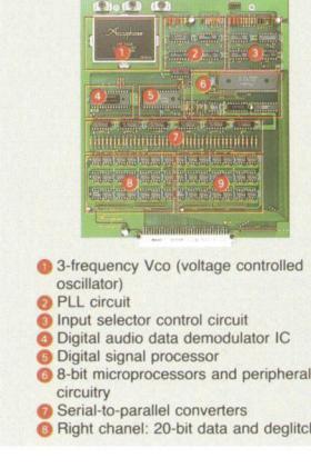 The block diagram of the digital processor unit DC-81L is shown in Fig. 2. A total of six inputs for digital signals are provided: three optical inputs conforming to the EIAJ standard and three inputs for 75-ohm coaxial cable. The unit also is equipped to handle three sampling frequencies, 48 kHz, 44.1 kHz, and 32 kHz. The DC-81L therefore can accommodate several CD players and can be used as a decoder also for a digital satellite broadcast tuner or DAT recorder.