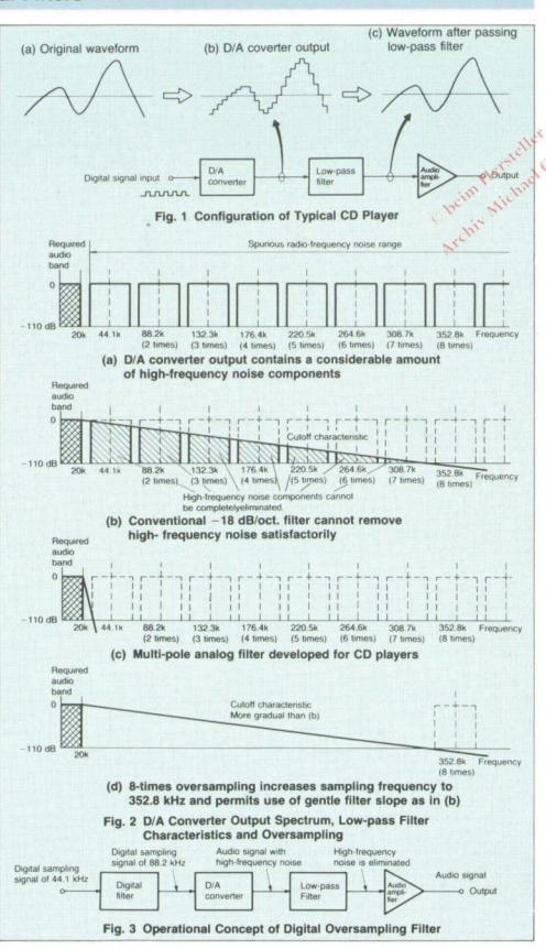 Fig. 1 shows the circuit configuration of a conventional CD player from the D/A converter to the output. As the input signal to the converter is asmpled at 44.1 kHz, the original waveform (a) becomes superimposed with the 44.1 kHz square wave signal, resulting in the staircase waveform (b). The output of the D/A converter contains the spectrum shown in Fig. 2 (a). In addition to the audio signal extending up to 20 kHz, there are high-frequency noise component at multiples of the sampling frequency (44.1 ± 20.4 kHz, 88.2 ± 20.4 kHz, 18.2 ± 20.4 kHz, at the signal are outside the audible range, their removal is very important, as they can cause the following problems: