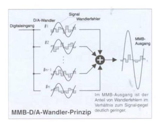 Wie aus der Abbildung hervorgeht, wird das Ausgangssignal eines schnellen Digitalfilters mit 8fachem Oversampling parallel zu den einzelnen Wandlerbausteinen geführt. Unmittelbar nach der Umwandlung, also noch im Hochgeschwindig-