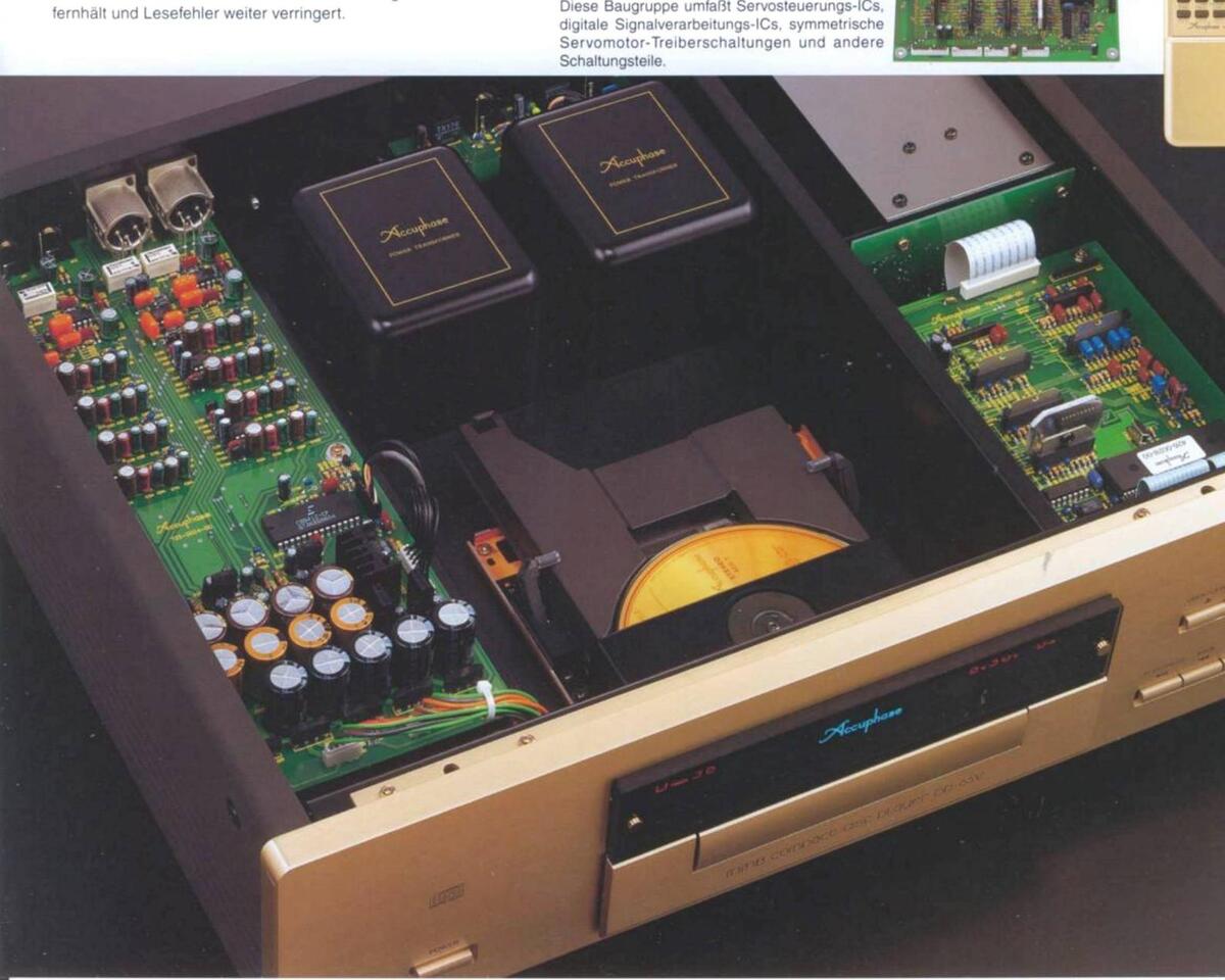 Völlig stabiler Betrieb und extrem niedrige Lesefehlerrate sind das Resultat dieser fortschrittlichen Technik. Der Laserabtaster ist ein ultrakompakter Typ mit integriertem HF-Verstärker, und die Treiberkreise für alle Servomotoren sind symmetrisch ausgelegt, so daß im Massekreis kein Strom fließt. Die Disc-Schublade wird während der Wiedergabe verriegelt, was mechanische Schwingungen wirkungsvoll unterdrückt und dafür sorgt, daß das digitale Ausgangssignal absolut sauber bleibt.
