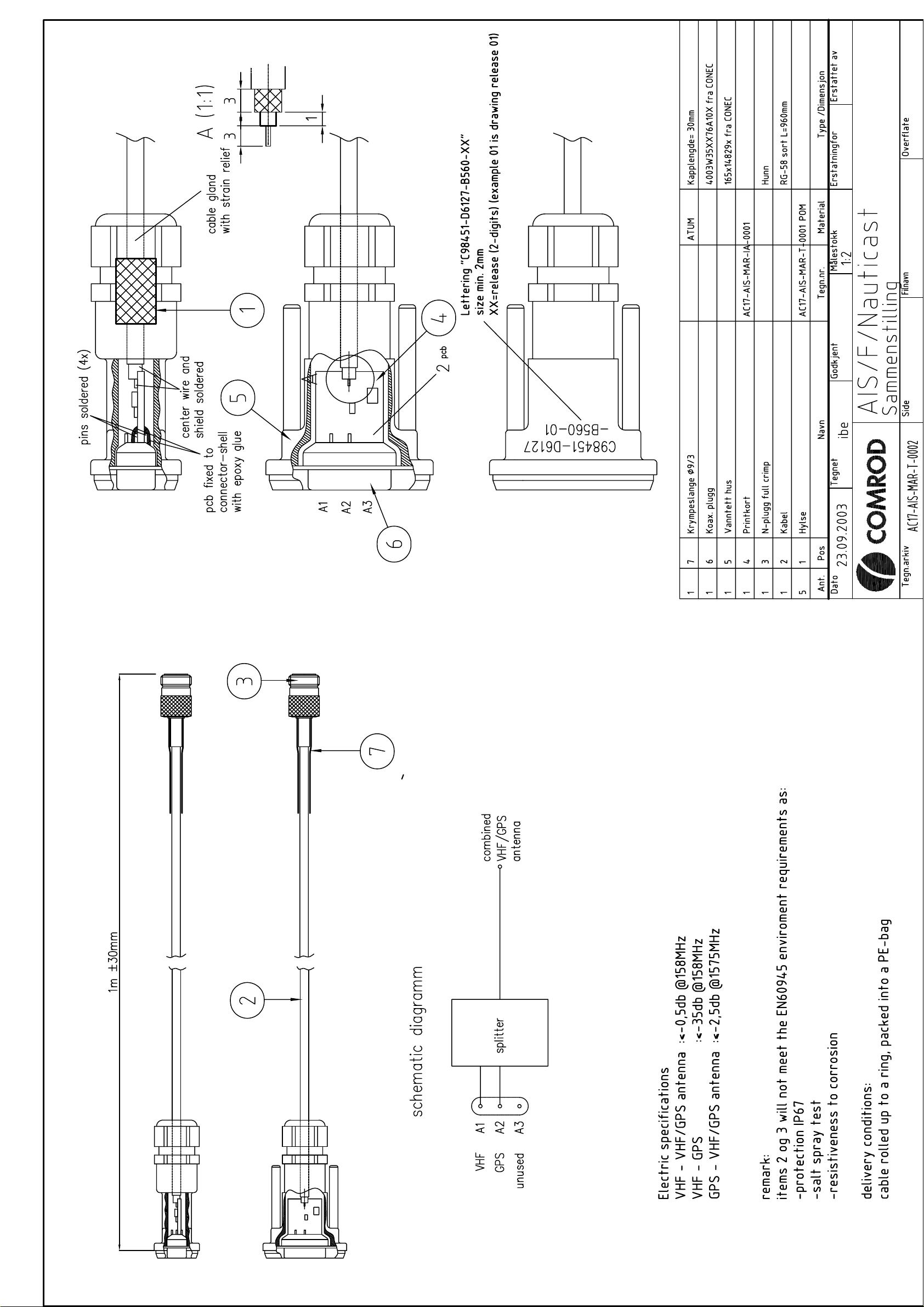 Comrod AC17 combined GPS/VHF Antenna + Splitter (in Cable integrated)