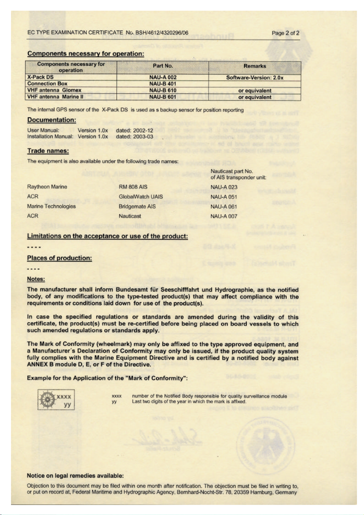 September 2002 and has been type examined by the Notified Body No. 0735 (BSH). The device is in full compliancy to