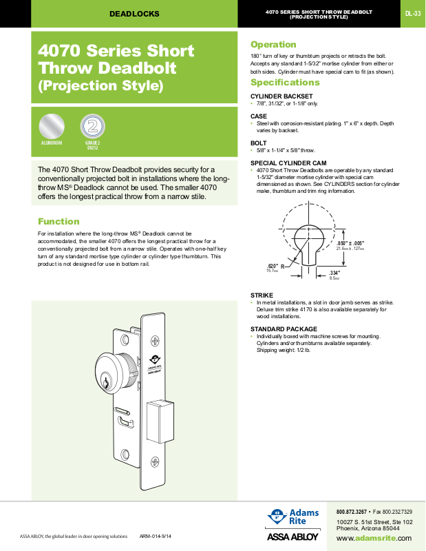 4070 Short Throw Deadbolts are operable by any standard 1-5/32"