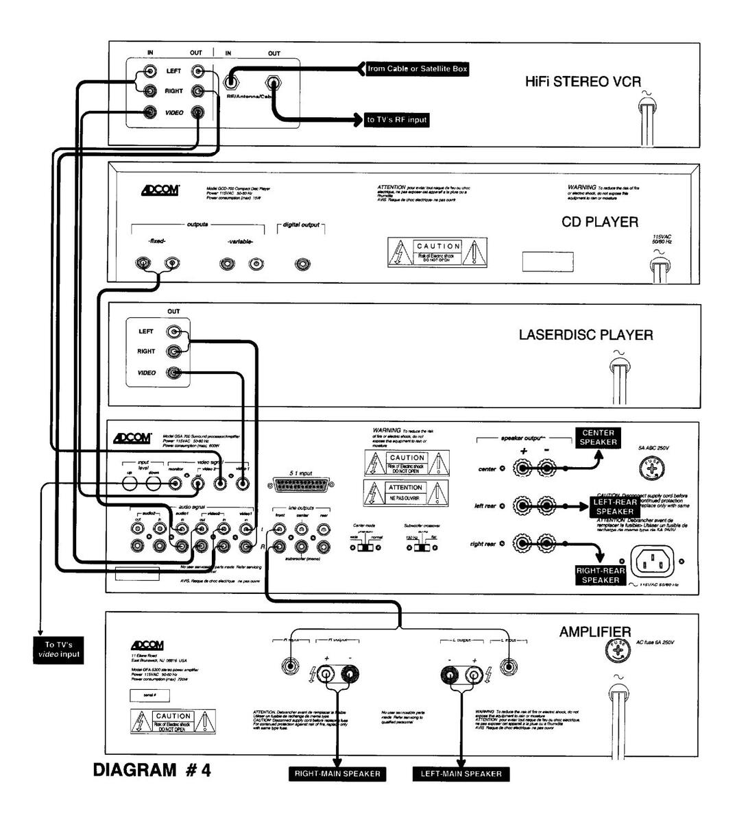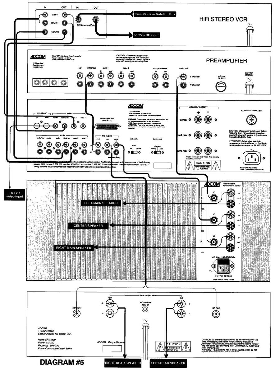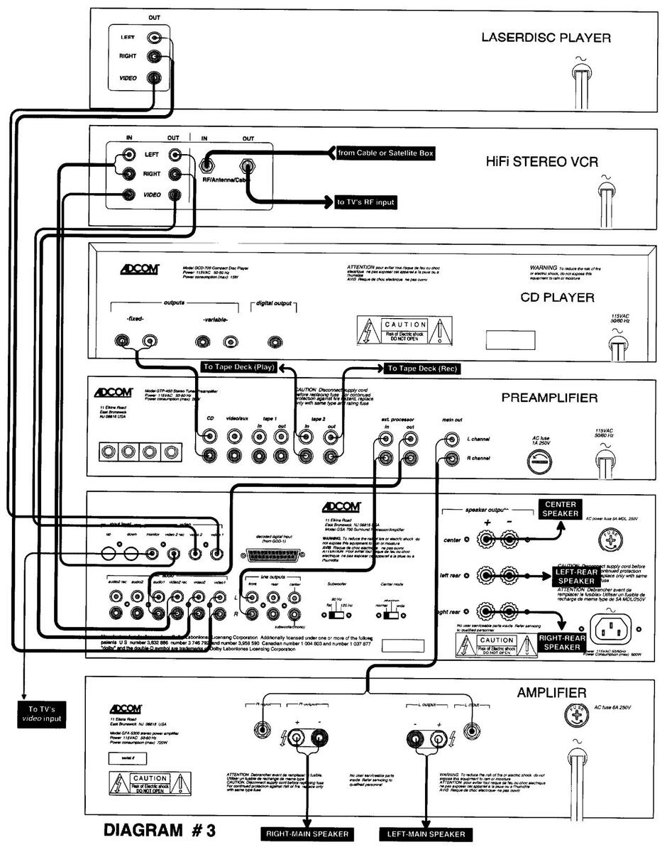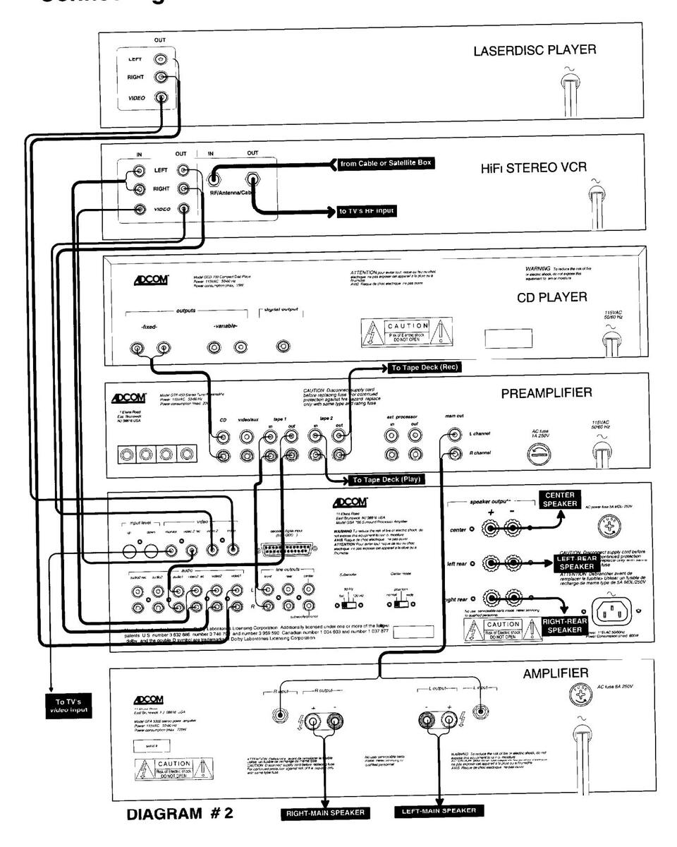 There are 4 primary ways to connect your GSA-700 to your existing stereo system. This text assumes that you either have a preamp and amplifier or a receiver, and at least one "source unit" such as a VCR, laserdisc, or CD player. There are a lot of possibilities for configurations and exceptions for any one of these. We are going to cover most situations and even some of the exceptions. If there are any problems or questions, contact Adcom's Customer Service Dept. (see Servicing on page 21).
