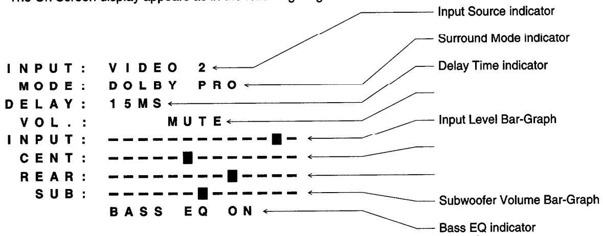 The MODE and DELAY sections will indicate which surround mode is selected and what the delay time is. The LEVEL section will show the word MUTE when the system is muted via the Audio Mute button ( 0 ) on the remote control. The bottom line will indicated whether the Bass EQ has been activated via the Bass EQ switch ( 0 or 9 ).