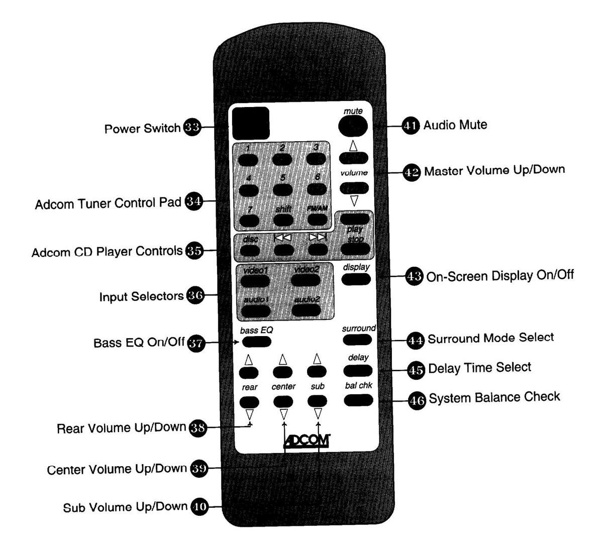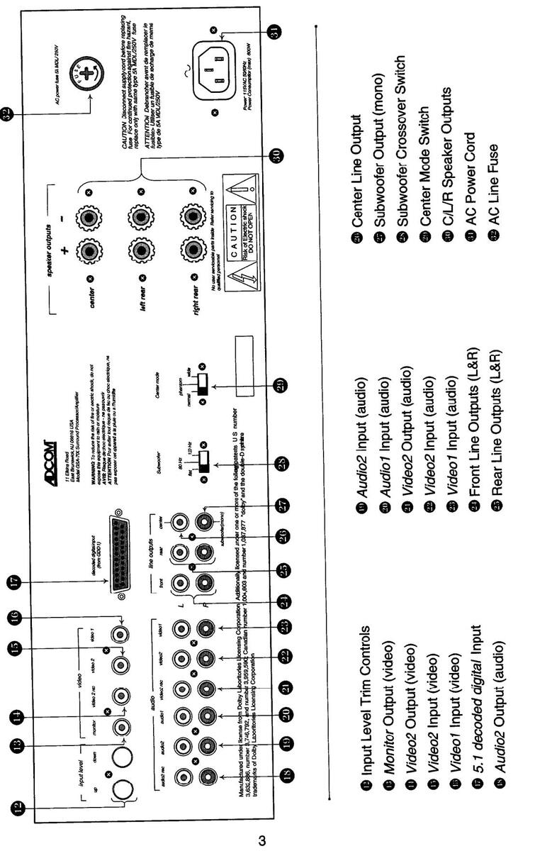 AC Line Cord: This is a detachable cord that is to be plugged into a household AC wall socket or Adcom ACE-515 (see "Turning Your System On and Off" on page 16). Do not plug it into a Receiver or Preamplifier's switched outlet unless that outlet is rated at, or over 600 Watts.