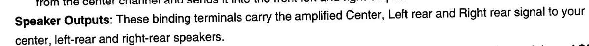 100 watts continuous average power into 8 ohms at any frequency: 20Hz to 20kHz with all channels driven at less than 0.05% THD for the Center Channel 50 watts continuous average power into 8 ohms (X 2) at any frequency: 20Hz to 20kHz with all channels driven at less