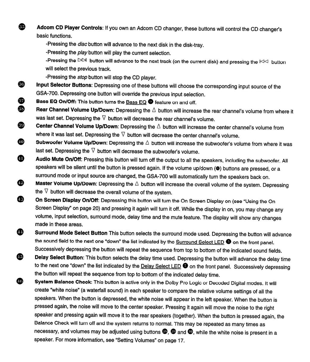 To use the System Balance Check, you must be in Dolby Pro Logic mode and it is recommended that no source be playing at the time. If you are not in Dolby Pro Logic mode when you run through the Balance Check, the GSA-700 will automatically revert to Pro Logic mode when the Balanced Check is done. The optimum manner to set the volume level is to utilize the remote control and sit in the primary listening position. Press the Bal Chk button ( ① ) on the remote. You will notice a "waterfall" type sound emanating from the front-left speaker. It will last until you press the button again, then it will move to the center speaker. Successively pressing of the button will advance the waterfall noise to the front-right speaker, then the two rear speakers at the same time. After the rear speakers, pressing the button again will deactivate the noise. By listening to the relative loudness of each speaker, you may adjust the independent volumes for the center and the rear speakers relative to the front left and right speakers , by using the Rear Volume Up/Down ( ④ ) and Center Volume Up/Down ( ④ ) on the front panel will blink slowly many times to indicate the change. If you have reached the upper or lower limits of the volume range, the LED(s) will blink 3 times rapidly.