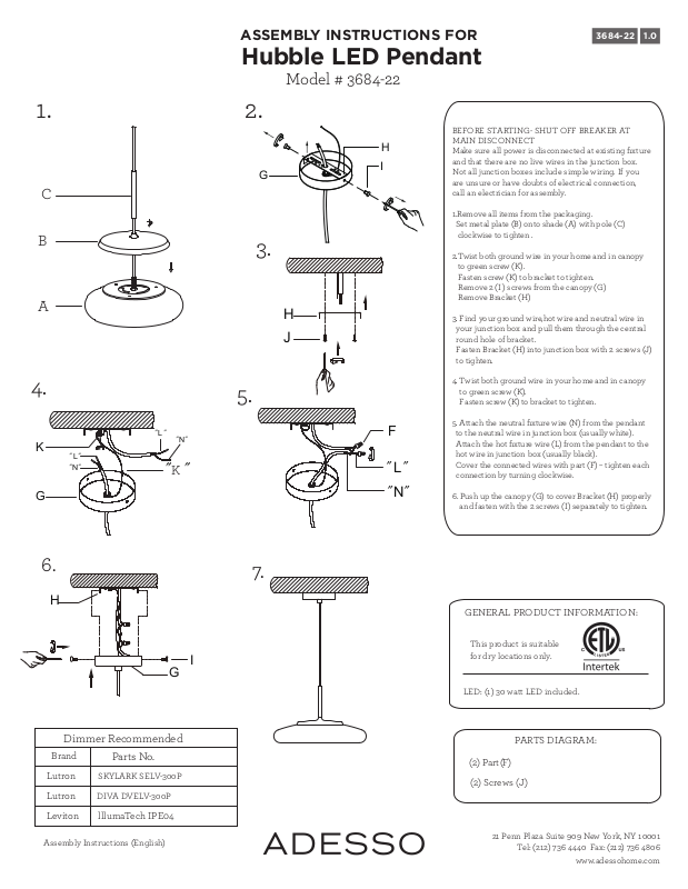 Fasten Bracket (H) into junction box with 2 screws (J)