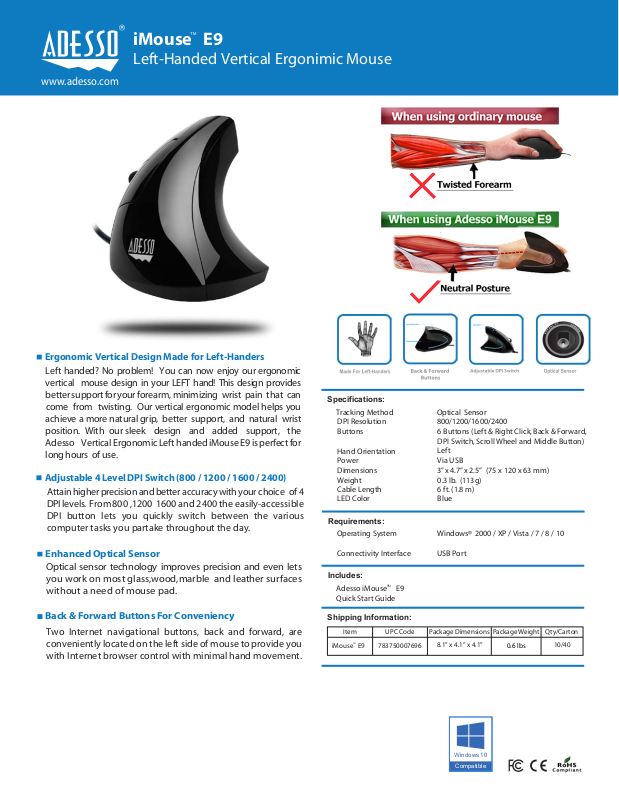 Adesso Vertical Ergonomic Left handed iMouse E9 is perfect for