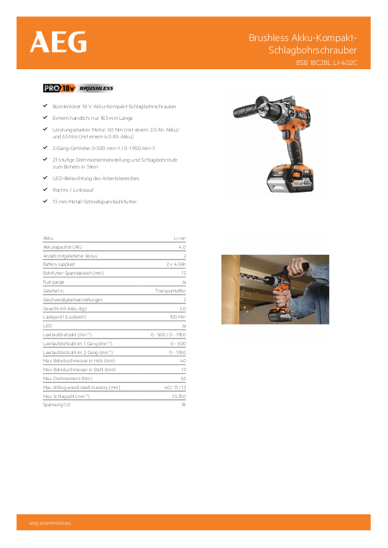 Max. drilling wood| steel| masonry [mm] 40 / 13 / 13