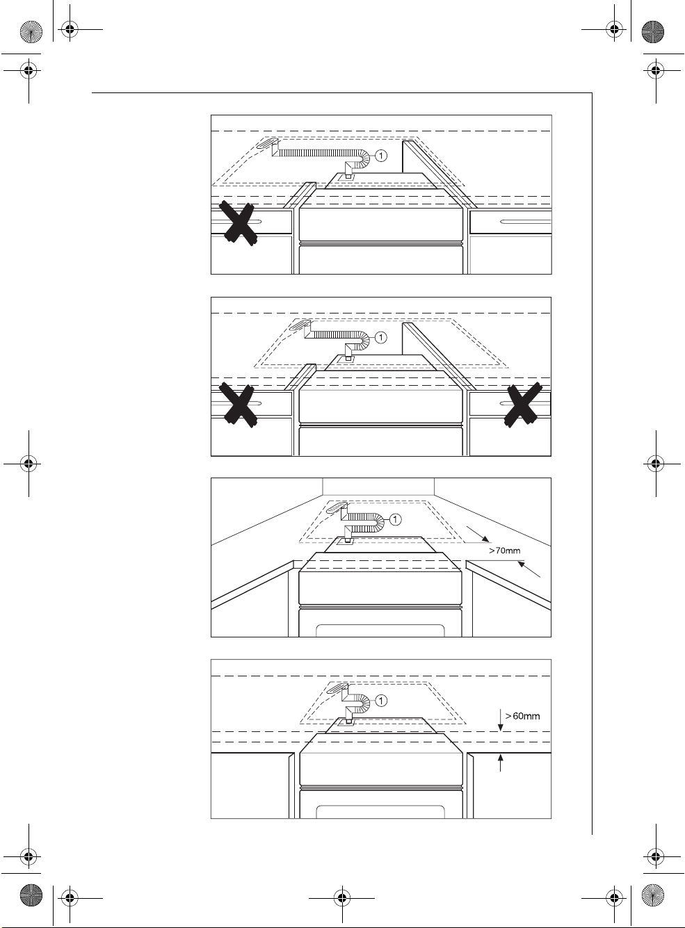 The distance between the body and the cooking zone should, however, never be less than 30 cm!