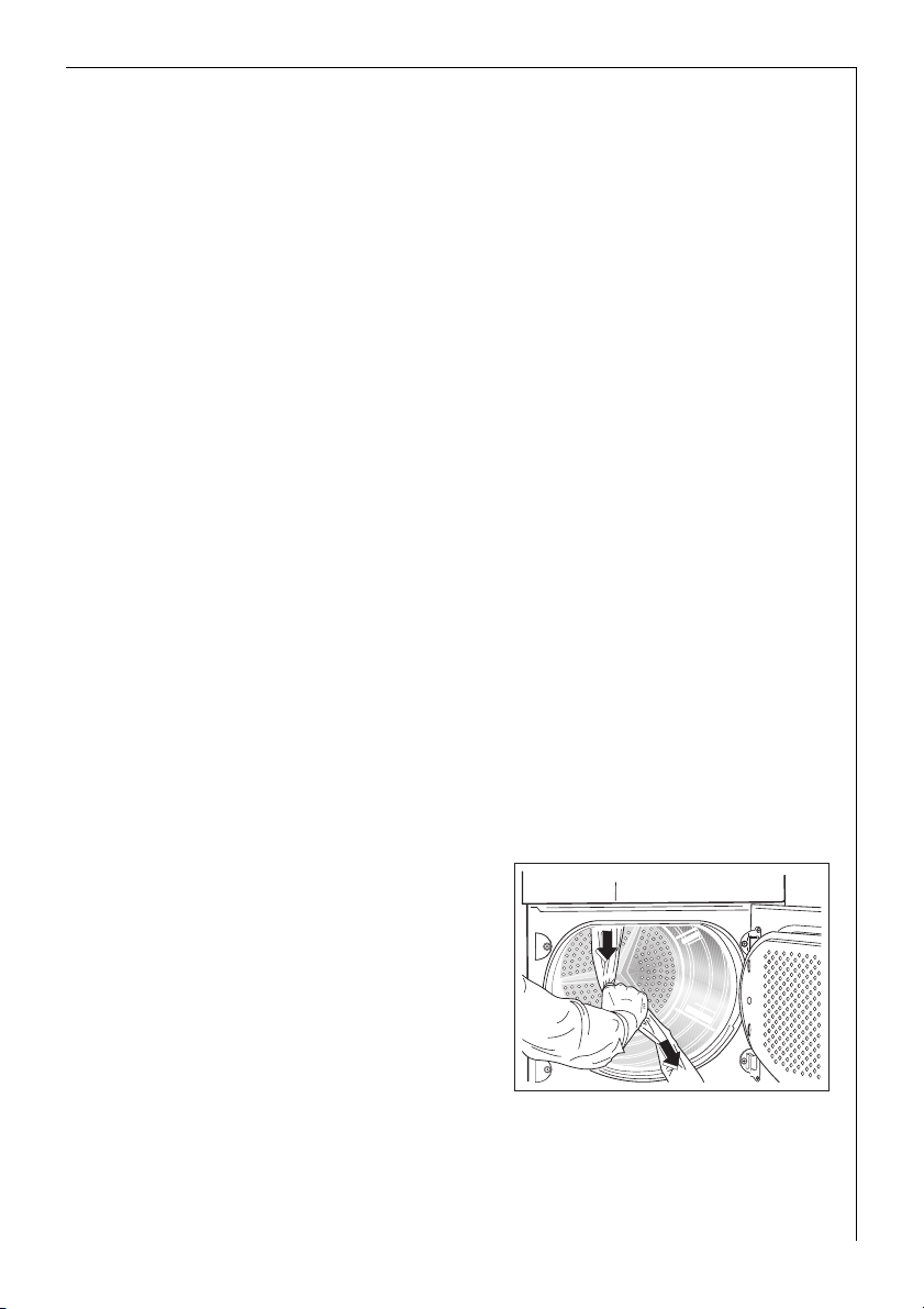 • Ikke legg tøystykker med løse fyllmaterialer (f.eks. puter) inn i tørketrommelen. Fare for brann!