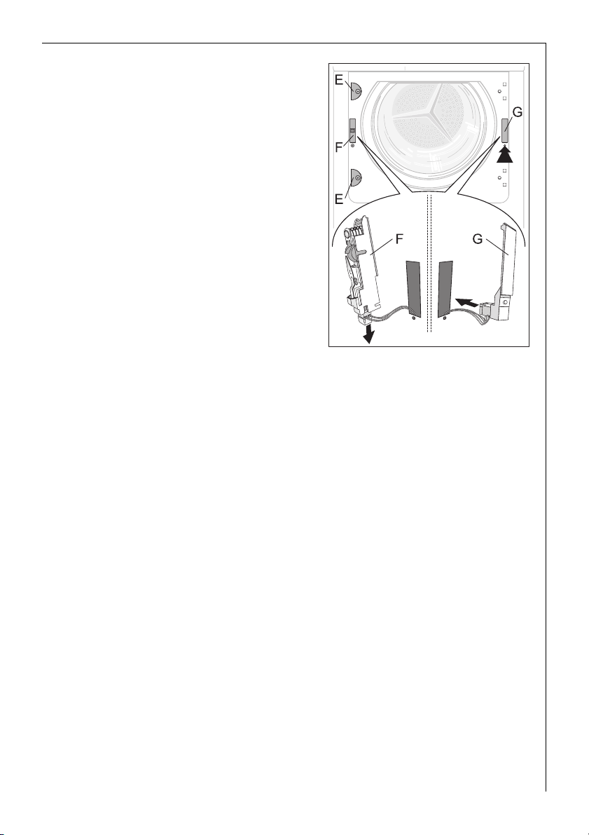 7.Skru av dekkplatene E fra tørketrommelens frontvegg, snu dem