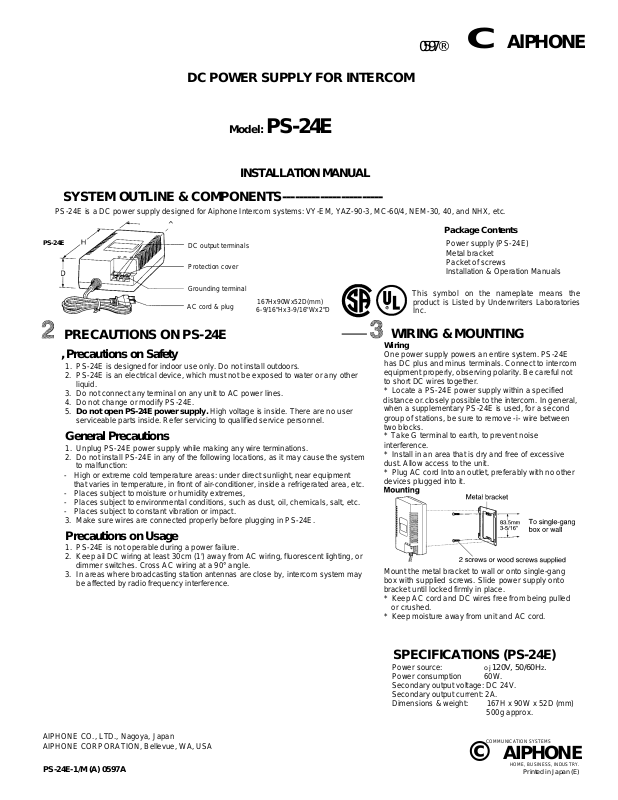PS-24E is a DC power supply designed for Aiphone Intercom systems: VY-EM, YAZ-90-3, MC-60/4, NEM-30, 40, and NHX, etc.