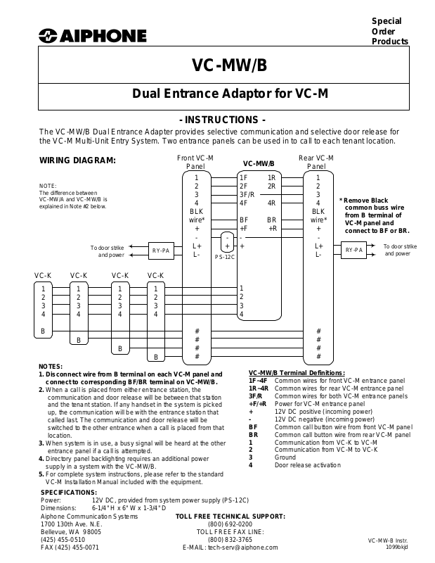 The VC-MW/B Dual Entrance Adapter provides selective communication and selective door release for