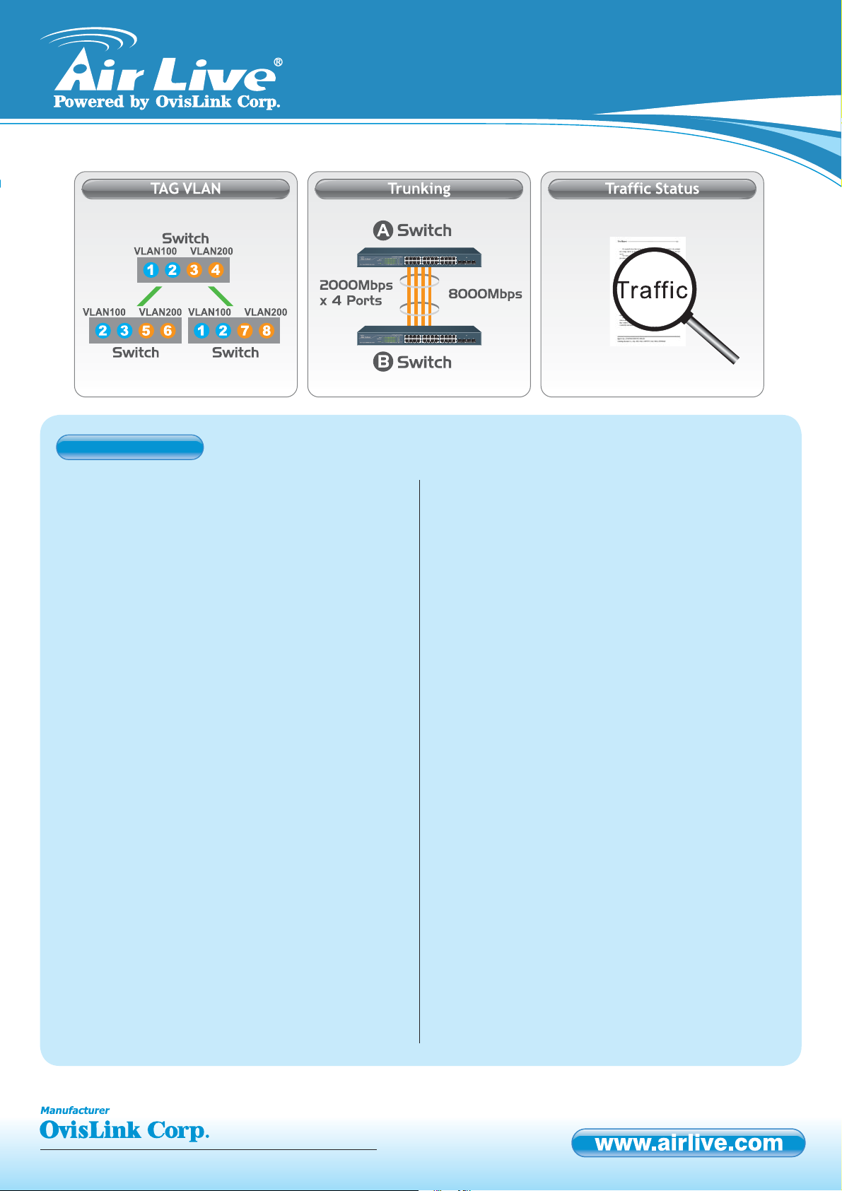- IEEE 802.1Q Tag-base VLAN, 4094 max, up to 24