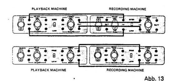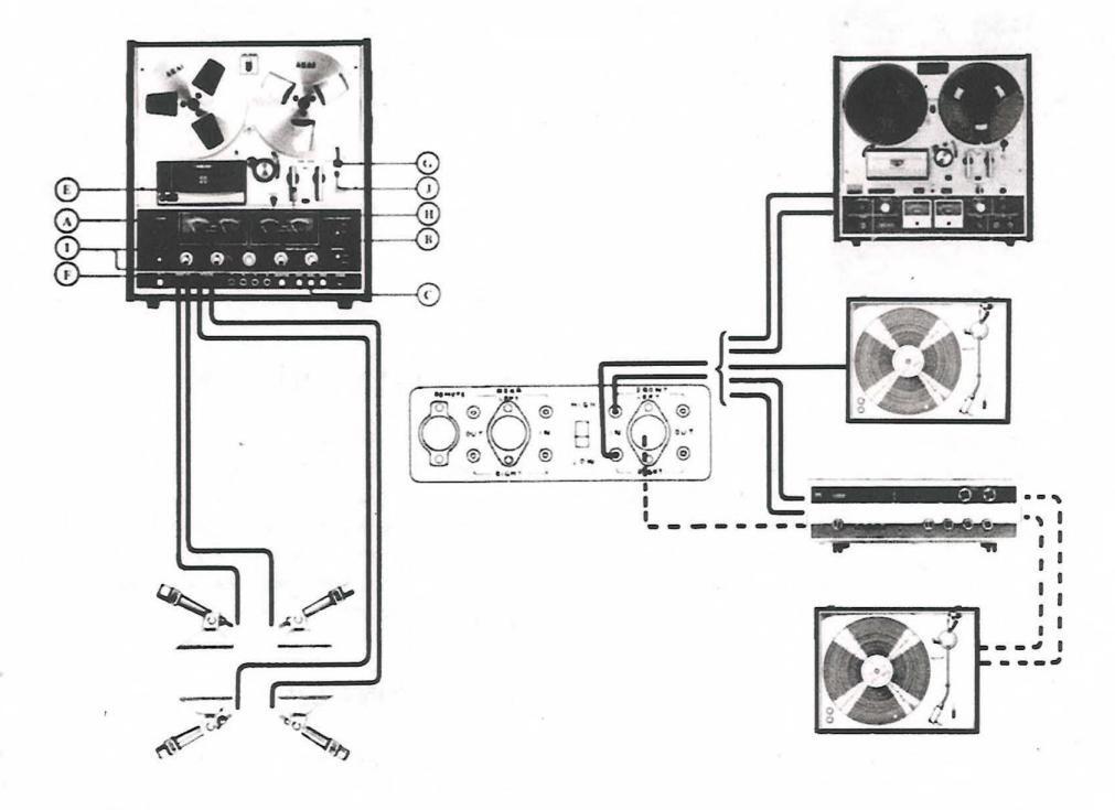 Bei Aufnahmen von einem externen Verstärker wird die Verbindung entweder mit einem DIN-Kabel hergestellt oder der Line-Ausgang des Verstärkers wird mit dem Line-Eingang des Tonbandgerätes verbunden. Der Aufnahmepegel wird mit Hilfe des Mikrofonaufnahmereglers bei der DIN-Buchse mit Hilfe der Line-Eingangsregler beim Line-Eingang kontrolliert. Die Überwachung geschieht über die Anzeigeinstrumente.
