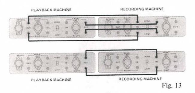 Bei Quadrophonieüberspielungen sind jeweils die 4 LINE-IN- oder LINE-OUT-Buchsen zu verwenden. Hierbei wird der Schritt F bei Quadrophonie-Aufnahmen ersetzt. Bei 2-Kanal-Stereoüberspielungen ist der Schritt F der Stereo-Aufnahme zu ersetzen. Das Überspielen kann mit einem Anschlußkabel DR-110 erfolgen, wobei die LINE-IN und OUT-Buchsen anzuschließen sind.