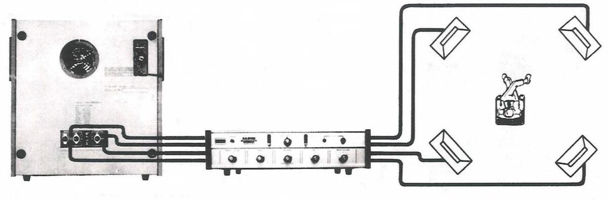 Netzkabel anschließen und vorbespieltes 4-Kanal-Stereo = Ouadrophonie-Tonband einlegen.