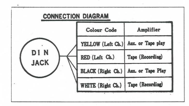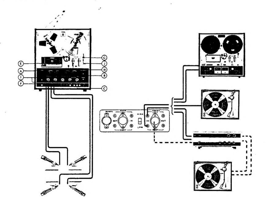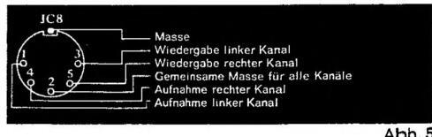 Mit Hilfe von 2 DIN-Anschlußkabeln werden die Anschlüsse zwischen Tonbandgerät und dem 4 Kanal-Gerät hergestellt. Es können jedoch hierfür auch die LINE-Eingangsbuchsen verwendet werden.