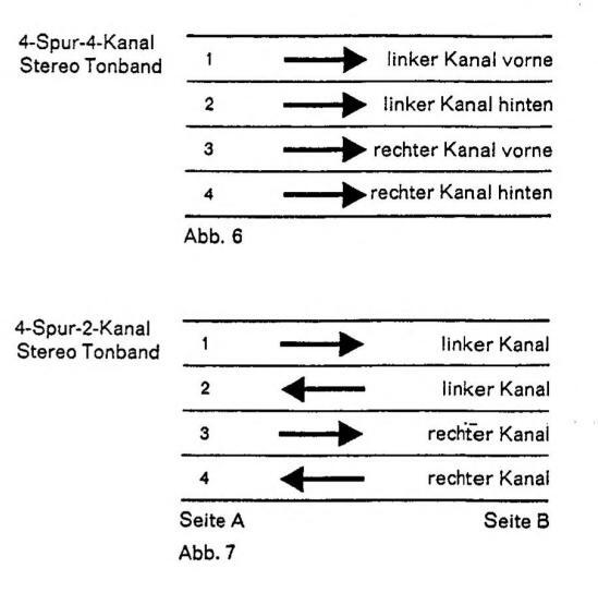 Bei der 4-Spur-Stereo = Quadrophonie werden ieweils 4 der insgesamt 8 Spuren des Bandes der Kassetten benützt. Die Reihenfolge der Spuraufnahme ist hierbei 1-3-5-
