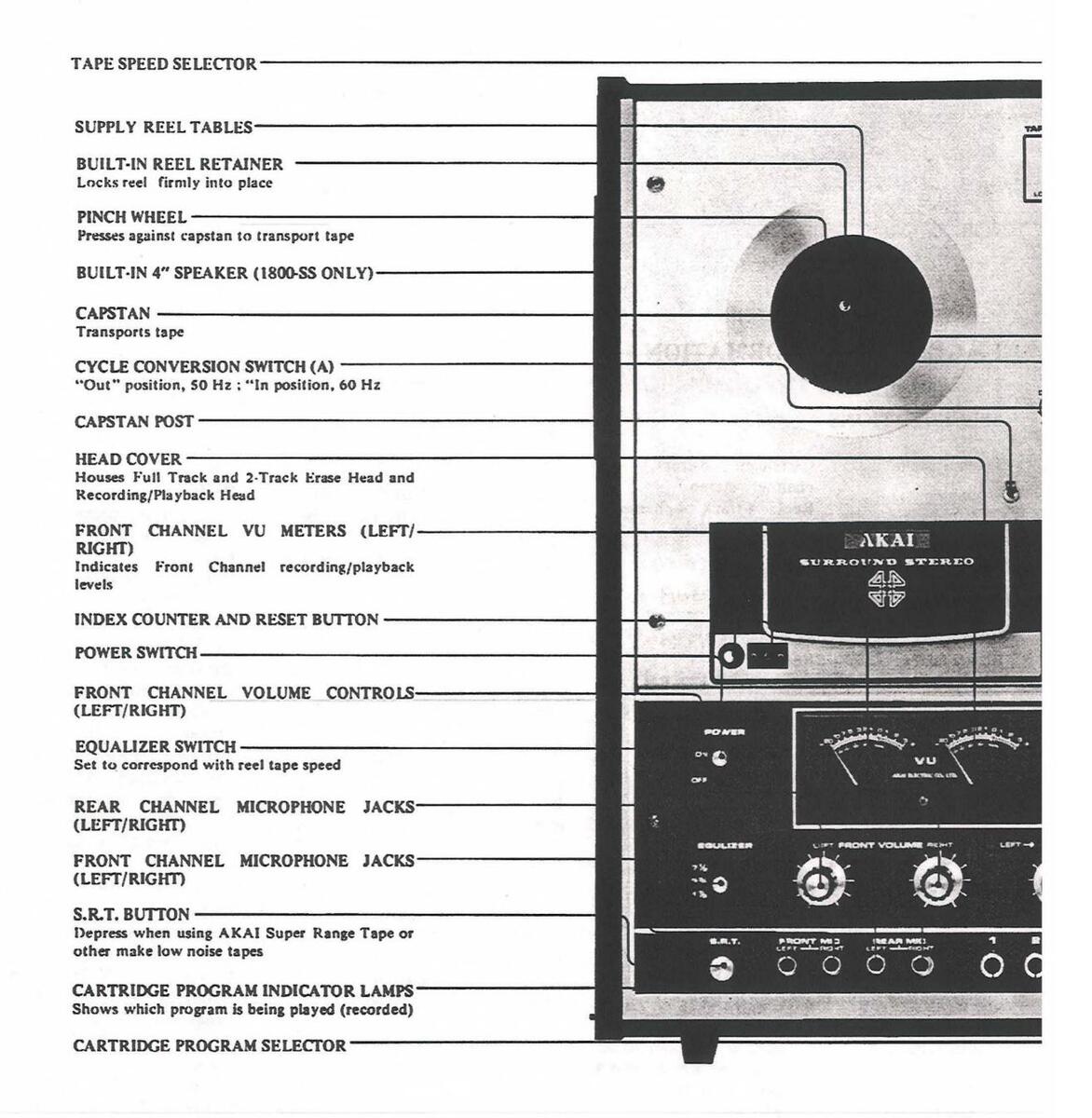 In dem 8 Spur Kassetten-Tonband dieses Gerätes befindet sich Akais spezielle Entwicklung, ein Tonkopf mit der extrem schmalen Spaltbreite von nur einem Micron. Wah rend sonst Spaltbreiten von 2–4 Micron üblich sind. Diese äußerst geringe Spaltbreite ist die Voraussetzung für die überragende Tonqualität mit ihrem ungewöhnlich großen Übertragungsbreich von 30 bis 17 000 Hz. Die hierd urch erreichte Wiedergabequalität ist nicht mehr zu unterscheiden von einer guten Bandaufnahme. Somit ist hierd urch der Abstand den bisher Kassettengeräte gegenüber normalen Tonbandgeräten in der Wiedergabequalität hatten so gut wie beseitigt.