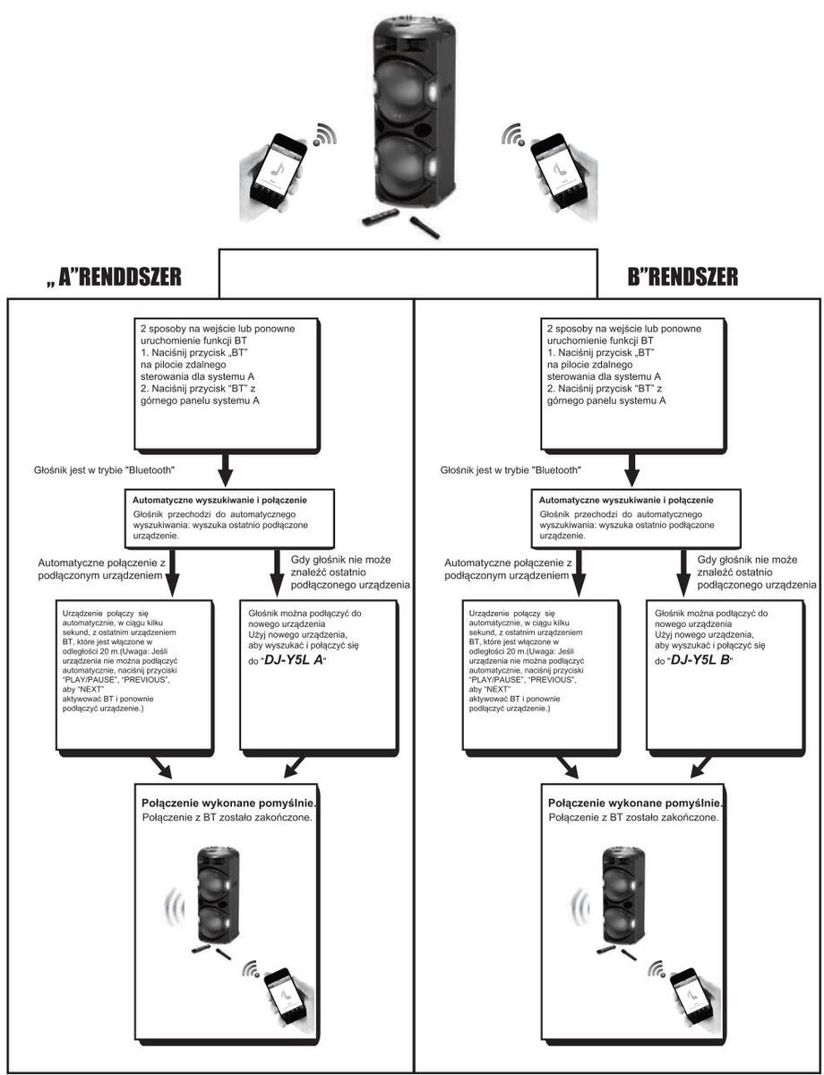 Uwaga: W trybie odtwarzania Bluetooth, wprowadzenie źródła USB/SD spowoduje rozłączenie funkcji Bluetooth i przełączenie na odtwarzanie muzyki z USB/SD. Krótko naciśnij przycisk BT, aby ponownie przełączyć się w tryb Bluetooth.