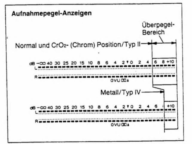 Der Einstellungsbereich für den Aufnahme-/Empfindlichkeitspegel liegt zwischen -3 dB und +3 dB des ursprünglichen Aufnahme-/Empfindlichkeitspegels für Normal-, CrO2- und Metall-Cassetten. Normalerweise sollte der Regler auf die Mittenanschlag-Position "0" eingestellt sein.