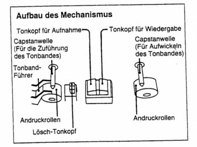 Nach langzeitiger Anwendung kann auf den Aufnahme- und Wiedergabe-Tonköpfen ein schwacher Magnetismus aufgebaut werden, sodaß hochfrequente Töne verloren gehen und der Rauschpegel erhöht wird. Um dies zu vermeiden, sollten Sie den Tonkopf von Zeit zu Zeit mit einer im Handel erhältlichen Tonkopf-Entmagnetisierungs-Drossel behandeln.