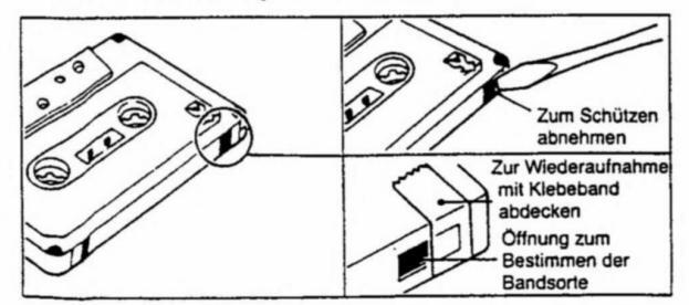 Um über eine bereits bespielte und geschützte Cassette wieder aufnehmen zu können, decken Sie die durch das Herausbrechen der Laschen entstandenen Öffnungen mit einem Klebeband ab.