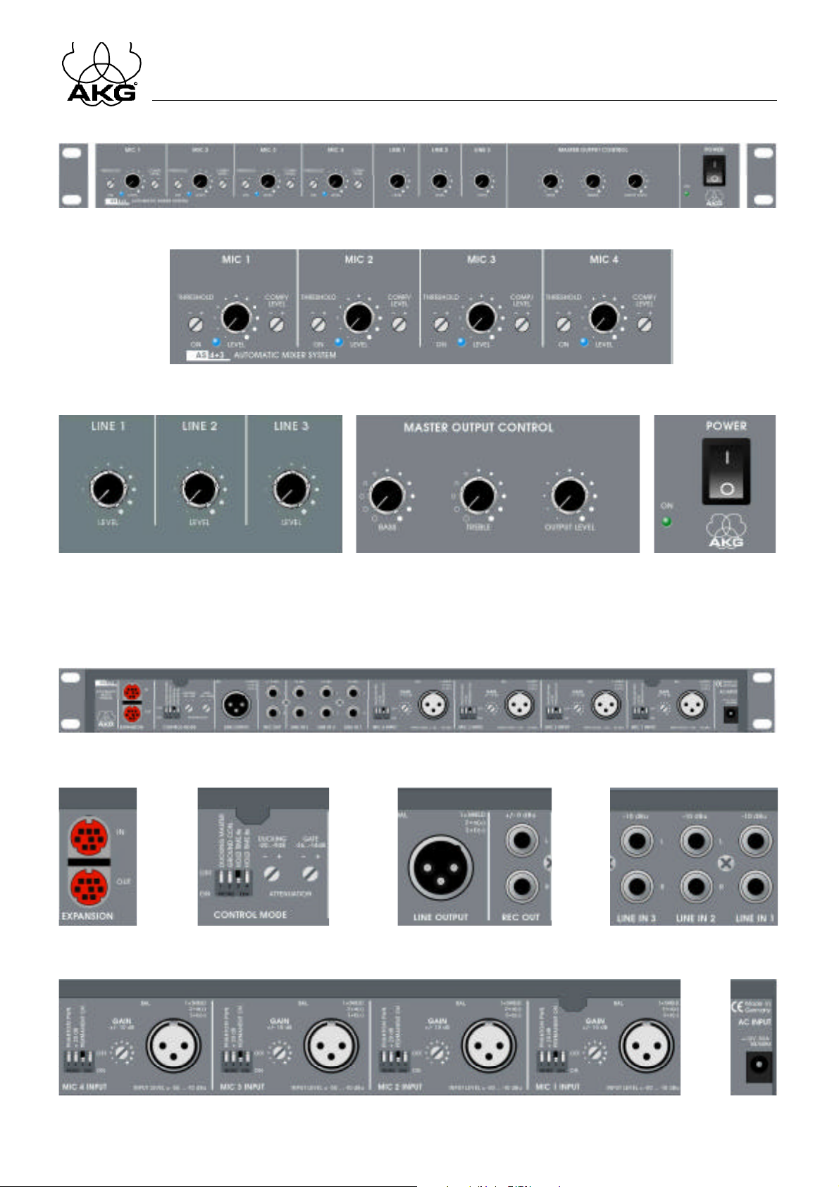 Spezielle "Expansion"-Buchsen ermöglichen Ihnen, bis zu zehn automatische Mischpulte AS 4+3 mit insgesamt 40 Mikrofoneingängen miteinander zu verbinden.