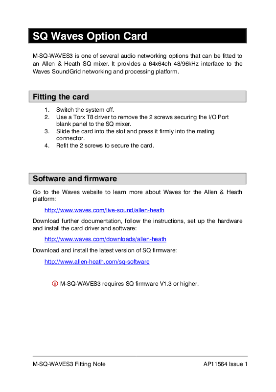M-SQ-WAVES3 requires SQ firmware V1.3 or higher.