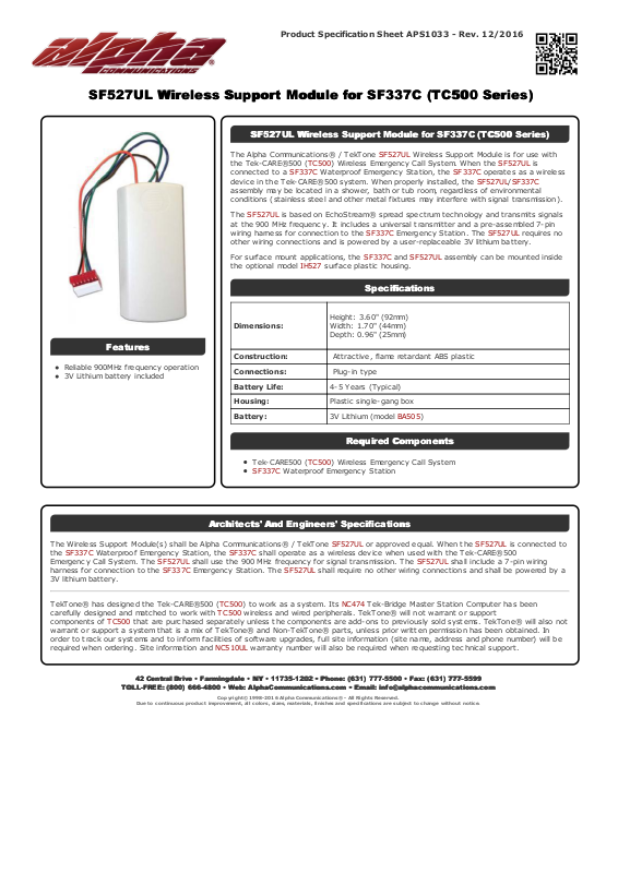 The Wireless Support Module(s) shall be Alpha Communications® / TekTone SF527UL or approved equal. When the SF527UL is c onnected t o