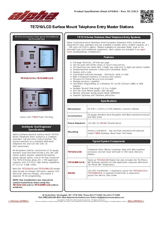 Alpha Communications® Stainless Steel Fac eplate Telephone Entry Syst ems are