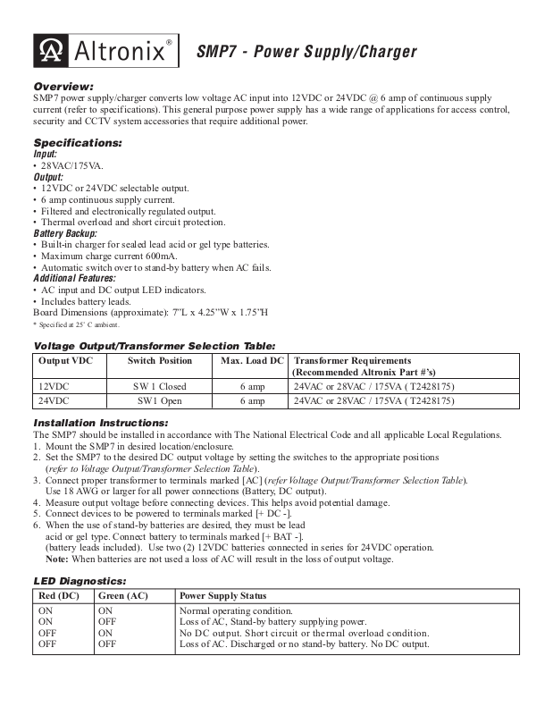 SMP7 power supply/charger converts low voltage AC input into 12VDC or 24VDC @ 6 amp of continuous supply