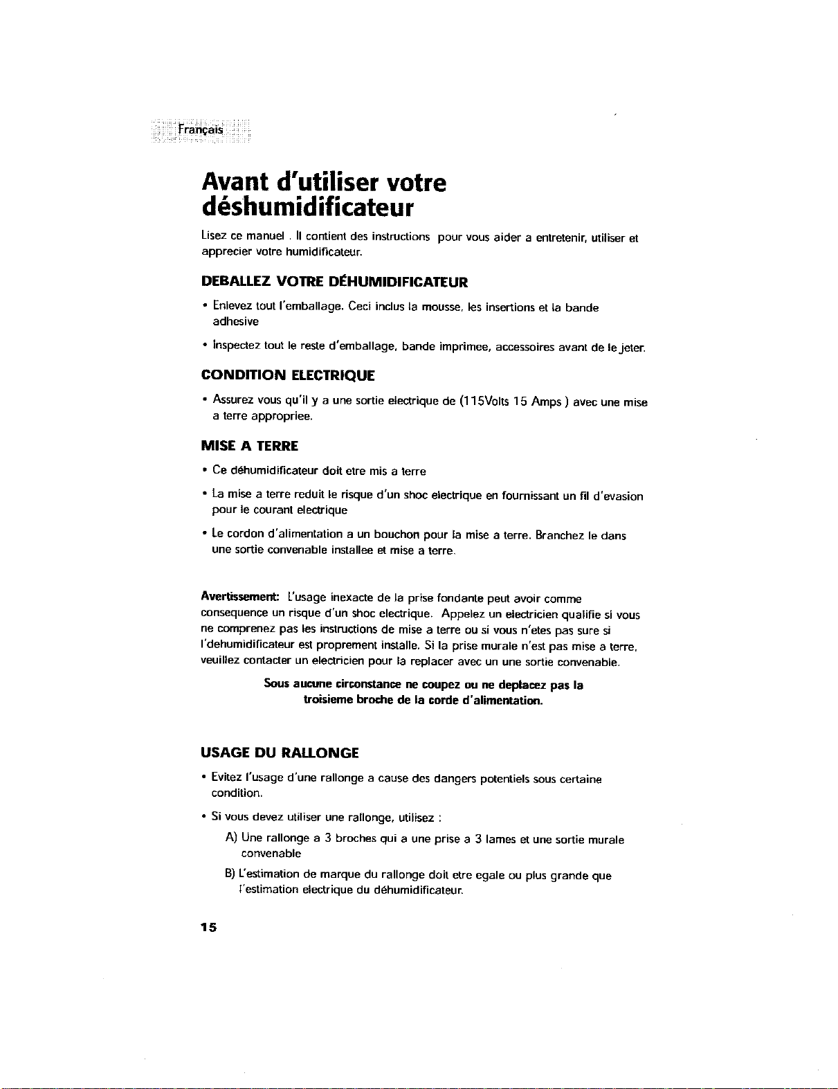 • This dehumidifier must be properly installed and grounded as described in this