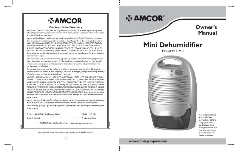 Thank you for purchasing an AMCOR Mini Dehumidifier. AMCOR is a leading brand