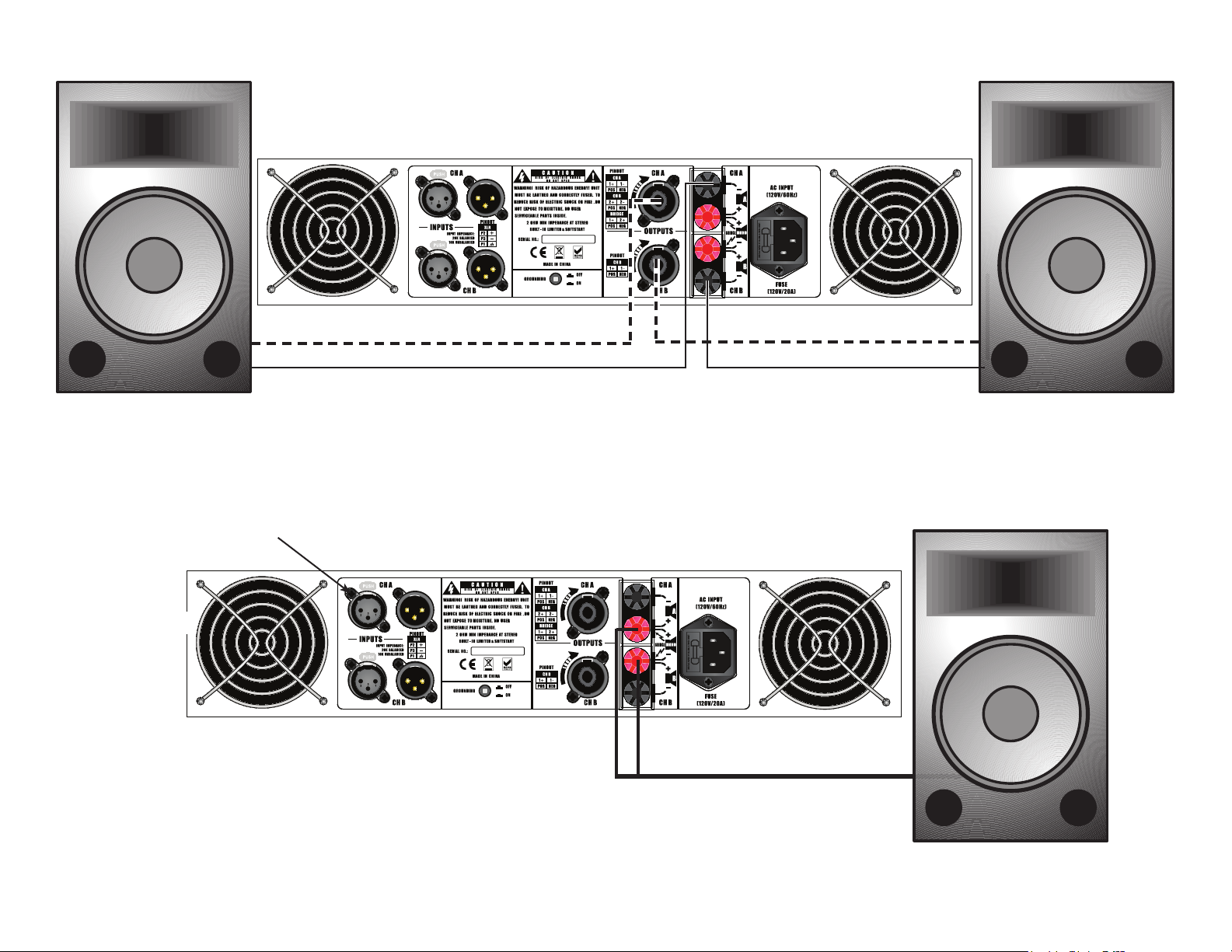 first amplifier’s input, patch from the amplifier’s THRU jacks to the next amplifier’s input, and so on, daisy-chaining as many amplifiers
