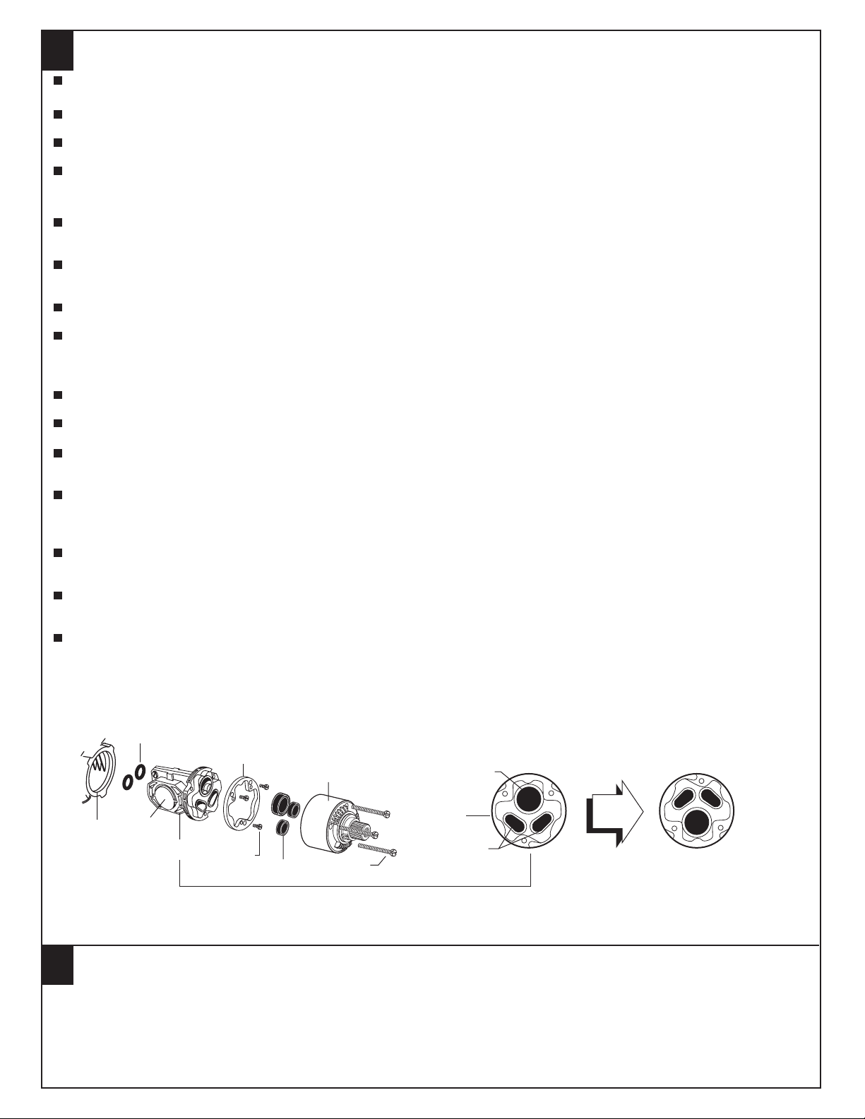 Push PRESSURE BALANCE UNIT (5) in casting make sure inlets line up with holes in bottom of casting. Top flange should