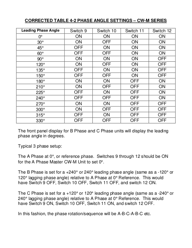 CORRECTED TABLE 4-2 PHASE ANGLE SETTINGS – CW-M SERIES