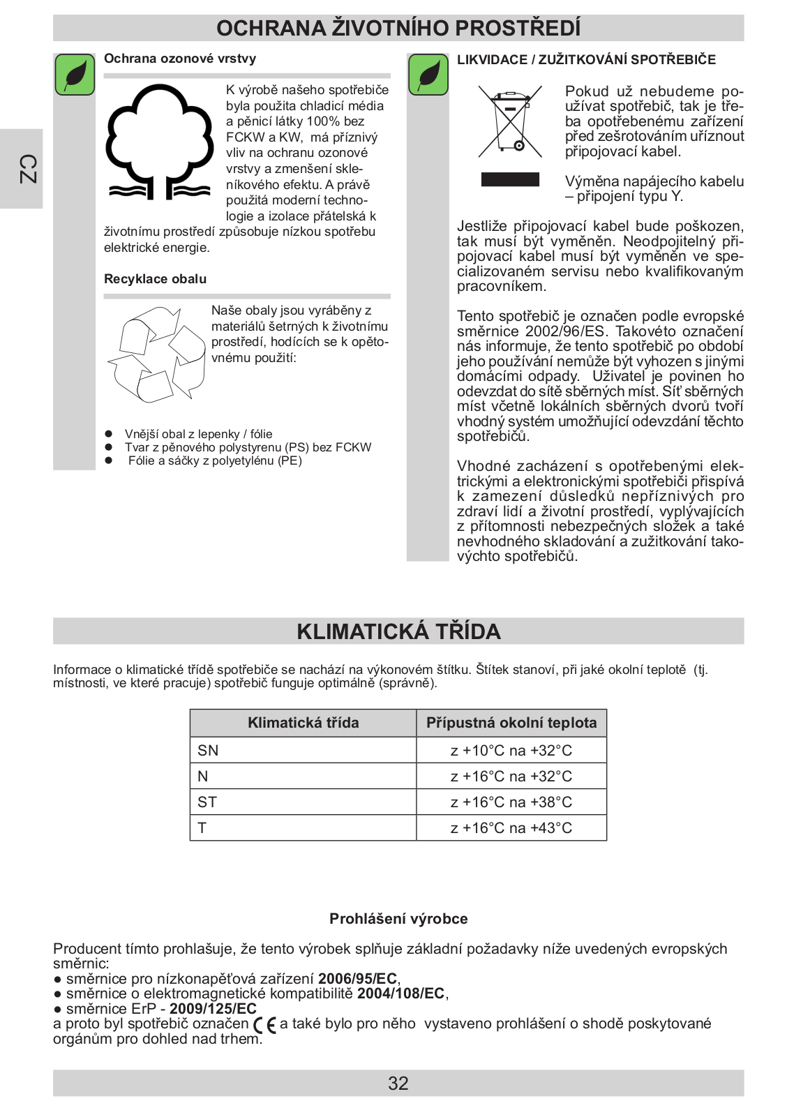 POKYNY TÝKAJÍCÍ SE BEZPEČNOSTI POUŽÍVÁNÍ INSTALACE A PROVOZNÍ PODMÍNKY SPOTŘEBIČE OBSLUHA A FUNKCE JAK EKONOMICKY POUŽÍVAT CHLADNIČKU ODMRAZOVÁNÍ, MYTÍ A ÚDRŽBA URČOVÁNÍ ZÁVAD OCHRANA ŽIVOTNÍHO PROSTŘEDÍ KLIMATICKÁ TŘÍDA ZÁRUKA |
