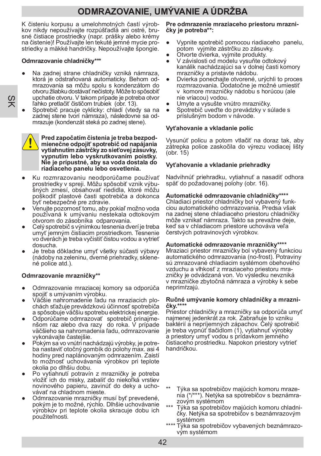 DÔLEŽITÉ BEZPEČNOSTNÉ POKYNY INŠTALÁCIA A PREVÁDZKOVÉ PODMIENKY SPOTREBIČA OBSLUHA A FUNKCIE AKO EKONOMICKY POUŽÍVAŤ CHLADNIČKU ODMRAZOVANIE, UMÝVANIE A ÚDRŽBA LOKALIZÁCIA ZÁVAD OCHRANA ŽIVOTNÉHO PROSTREDIA KLIMATICKÁ TRIEDA ZÁRUKA |