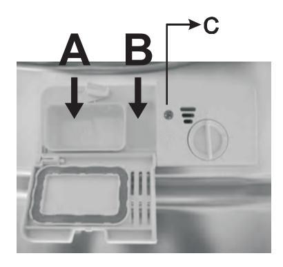 zmywaniem. Pojemnik B należy napełniać przed każdym programem, który przewiduje mycie wstępne. |